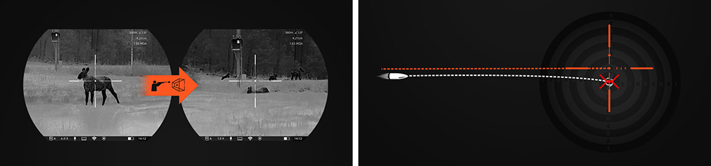 The ballistic calculator enhances accurate shooting at distant targets with automatic angle compensation analysis and custom impact reticles. It optimizes the aiming process by analyzing parameters such as wind speed and direction, bullet velocity, and temperature, to effectively reach your target and enhance your hit rate.